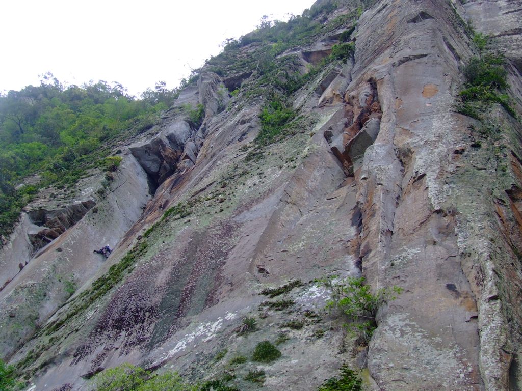Acabei chegando a conclusão que as vias aqui na serra são muito mais exigentes, nossas paredes de arenito só oferece linhas pra escalada onde a parede quase não molha, ou seja, se a parede é positiva acaba acumulando restos de plantas, por sempre ter mata nos cumes, e esse acúmulo com a chuva que é quase diária se transforma em mato, resumindo, as linhas limpas e perfeitas são bem verticais ou negativa, e como o maior potencial são as fendas que temos, o bicho pega mais ainda. São fendas contínuas que nunca vi no Brasil, poucos pontos de descanso, quase não existe platôs, e o psicológico tem que estar trabalhando bem.